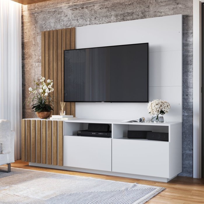 O Rack com Painel RNPL180 é produzido em MDP 15mm, possui 3 portas, sendo que uma delas possui detalhe ripado que torna o móvel ainda mais elegante e diferenciado. Este móvel conta com 2 nichos para você colocar seus eletrônicos e pertences e com amplo espaço interno nas portas e no tampo suportando Tv até 65 polegadas.