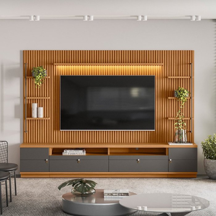 Rack com Painel para TV até 75 Polegadas com 2 Módulos Laterais LED 2 Portas Linea Brasil Nature/Chumbo