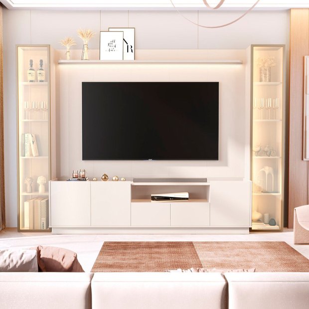 A iluminação embutida valoriza o painel e cria uma atmosfera acolhedora, destacando a TV e os objetos decorativos. O conjunto conta com 2 cristaleiras lateral com portas em vidro reflecta, que proporcionam um efeito elegante e contemporâneo. As molduras em alumínio garantem resistência e acabamento refinado, enquanto as dobradiças com amortecedor asseguram um fechamento suave, silencioso e confortável.