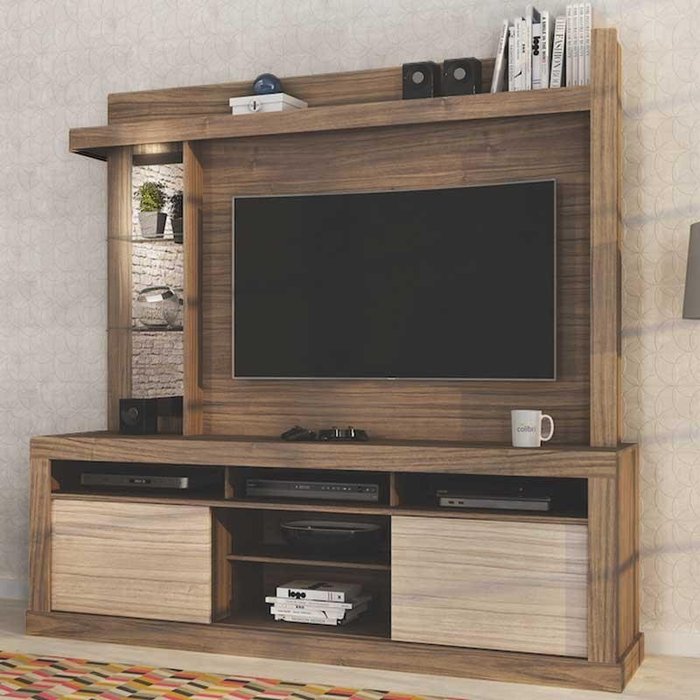 - Portas de correr; portas flex (de um lado imbuia real, do outro frassino); vistas decorativas; espelhos decorativos; prateleiras de vidro; led; trilhos de alumínio; suporta TV de até 51 polegadas. Pode ser montado nas cores malbec/riviera ou 100% malbec e canela rústico/dunas ou 100% canela rústico.