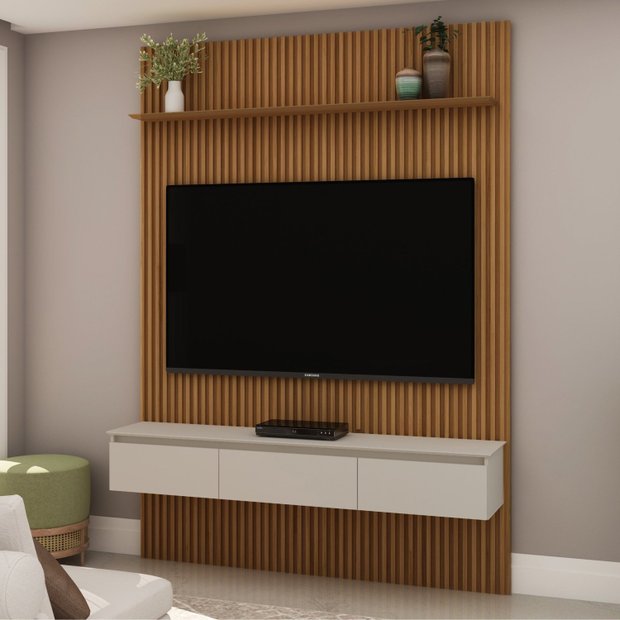 Se você procura manter seu ambiente organizado, onde possa guardar seus aparelhos eletrônicos, entre outros objetos, deixando com um ar mais clean e ao mesmo tempo com uma decoração inovadora e sofisticada, conheça o conjunto que falta para sua casa, Rack com Painel Ripado e Gavetas Vik da Robel Móveis, ele é composto por um painel ripado de 1,80 de largura, um rack suspenso com duas gavetas com sistema de corrediças telescópicas, uma porta basculante e uma prateleira com acabamento chanfrado em pintura PU. A combinação de pintura UV e MDF garante uma durabilidade e segurança maior para seu produto.