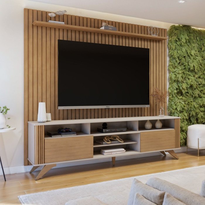 Quer dar aquele toque especial na sua sala? Nosso Rack com Painel ripado é a escolha perfeita! Com um design moderno e sofisticado, ele conta com nichos decorativos que mantêm o ambiente organizado e elegante. O painel ripado traz um charme extra e um visual aconchegante, ideal para quem busca estilo e funcionalidade. Recomendado para TVs de até 65", possui tampo com borda arredondada e pés robustos de madeira maciça, garantindo estabilidade e sofisticação. Aproveite e transforme sua sala!