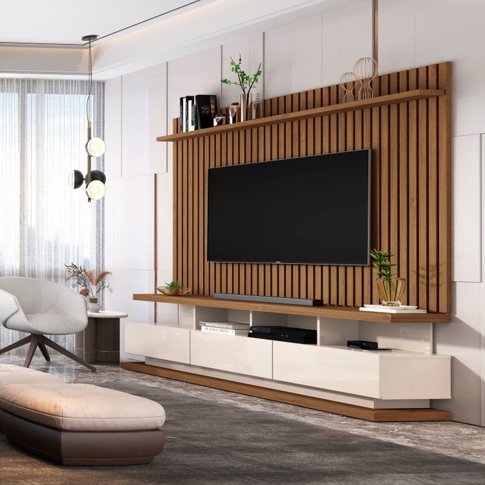 O conjunto Painel Classic e Rack Vivare é a escolha ideal para quem procura modernidade e estilo. Esta dupla é composta pelo painel de ripas reais e prateleira para sua decoração. O rack com 3 gavetas espaçosas com corrediças telescópicas e espaço para os seus equipamentos que agrega a organização dando um toque de sofisticação e beleza. O diferencial deste conjunto está nos seus pés com rodízios que facilita o acesso a tomadas e aos fios dos equipamentos, dando facilidade também para a limpeza.