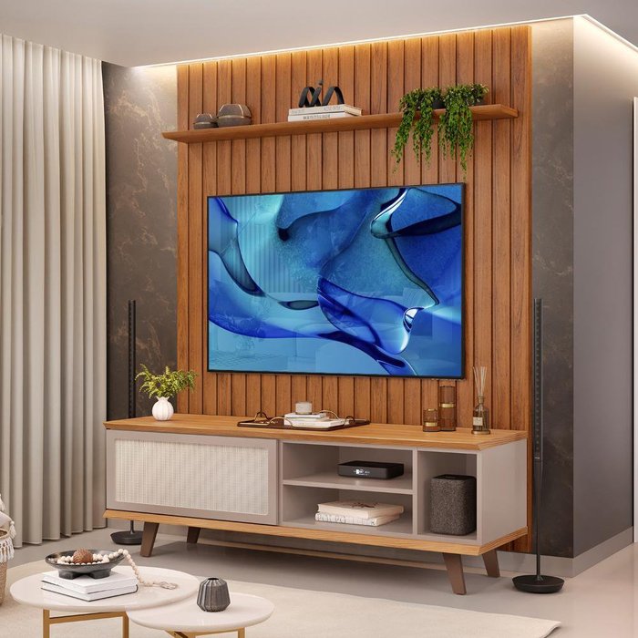 Dimensões do painel: Largura 143,7 cm; Profundidade 19 cm; Altura 240 cm.Dimensões do rack: Largura 136 cm; Profundidade 45 cm; Altura 50 cm.Itens Inclusos: 1 rack e 1 painel- Estrutura em MDF/MDP- Painel ripado de verdade, garantindo elegância ao seu ambiente- Tampos e base chanfrados de 25mm- 1 porta deslizante usinada com tela decorativa- Nichos para aparelhos eletrônicos- Prateleira superior com borda chanfrada- Pés em polipropileno estilo retrô- Suporta TV de até 60 polegadas- Possui furação para passagem de cabos- Possui sapatas para proteger contra umidade do piso