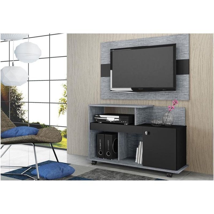 Rack com Rodízios Flash e Painel para TV LED New - Belaflex - Cinza Alpino / Preto Fosco