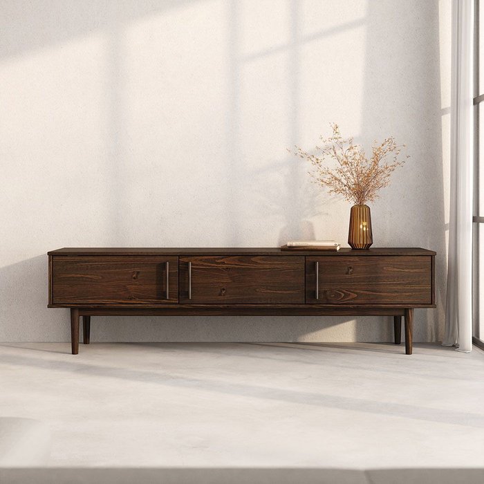 Com acabamento na cor Imbuia, o Rack Minimalista Para Sala de Madeira Maciça com Pés Retos Tecca destaca a profundidade dos veios da madeira maciça com um ar envolvente e minimalista. Seu tom escuro traz contraste e personalidade sem perder a leveza do design, ideal para quem busca sofisticação.