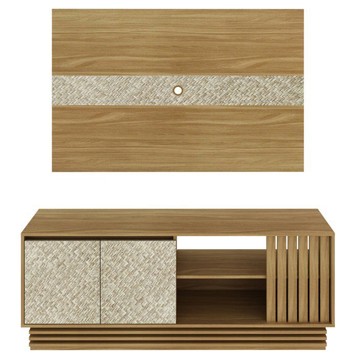 Conjunto De Rack e Painel para TV - R1480/PA2913. Com estilo para você compor sua sala, deixando sua decoração ainda mais elegante. Possui estrutura em MDP de 15mm, acabamento em pintura Uv (Semi Fosco). Painel com sistema de fixação resistente garantindo a segurança do produto, conta com furação para passagem de cabos e detalhe central em impressão na cor palha texturizada, painel ideal para Tv de até 42" Pol. Rack equipado com 02 portas com dobradiças metálicas, possui lateral em ripado e duas prateleiras para itens decorativos ou aparelhos eletrônicos, rodapé com detalhe decorativo ripado, frente das portas com acabamento em impressão na cor Palha Texturizada, proporcionando um visual moderno e elegante ao ambiente, rack ideal para Tvs de até 64" Pol, desenvolvido 100% ecologicamente correto, o que garante a resistência e vitalidade do produto. Estes móveis chegarão na sua casa separados em 02 volumes.