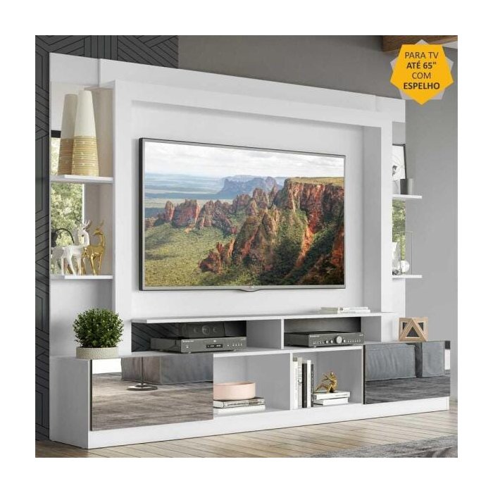 Rack Estante com Painel TV 65 Polegadas e Espelho Oslo Multimóveis Branco/Tenerife Branco