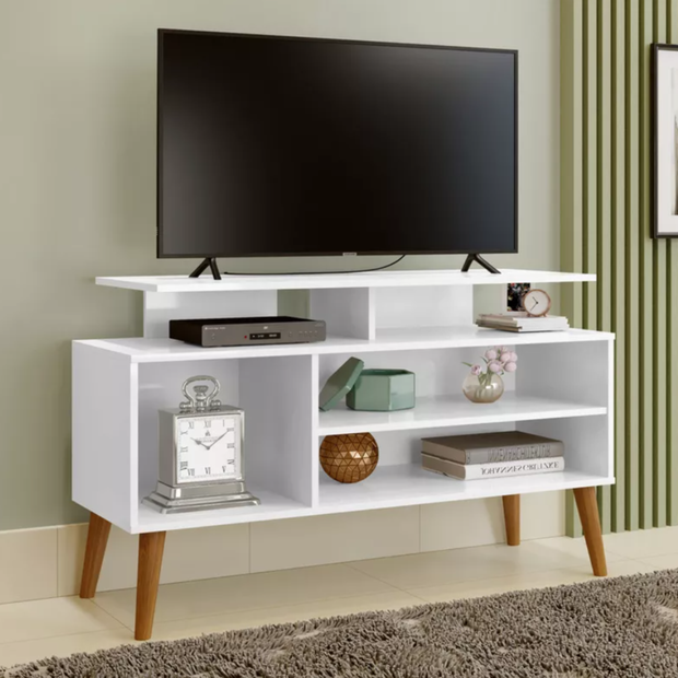 Design moderno e compacto, com prateleiras para eletrônicos e decoração. Fácil montagem com manual e peças inclusas. Origem: Brasil.