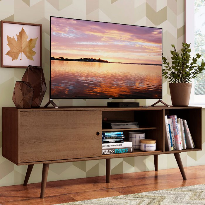 Desenvolvido com base em tendências contemporâneas de design, possui uma distribuição muito bem pensada: são quatro nichos de tamanhos variados e uma porta de correr. Assim, há espaço para decoração, aparelhos eletrônicos, livros e muito mais.