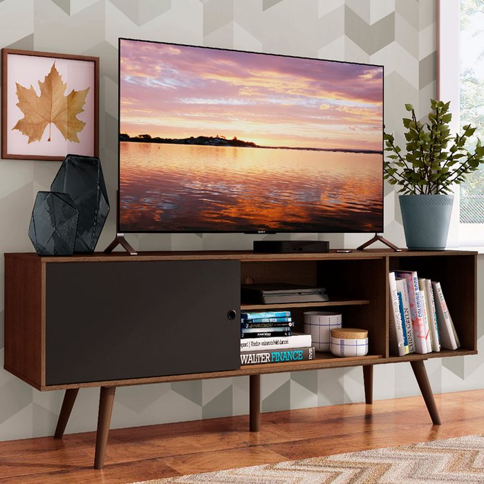 Desenvolvido com base em tendências contemporâneas de design, possui uma distribuição muito bem pensada: são quatro nichos de tamanhos variados e uma porta de correr. Assim, há espaço para decoração, aparelhos eletrônicos, livros e muito mais.