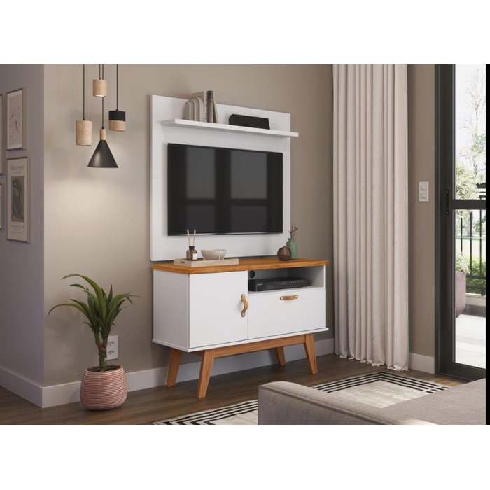 Rack + Painel Si 0.90m Estilo Retrô para Tv até 32'' Polegadas Cor Branco / Cinamomo