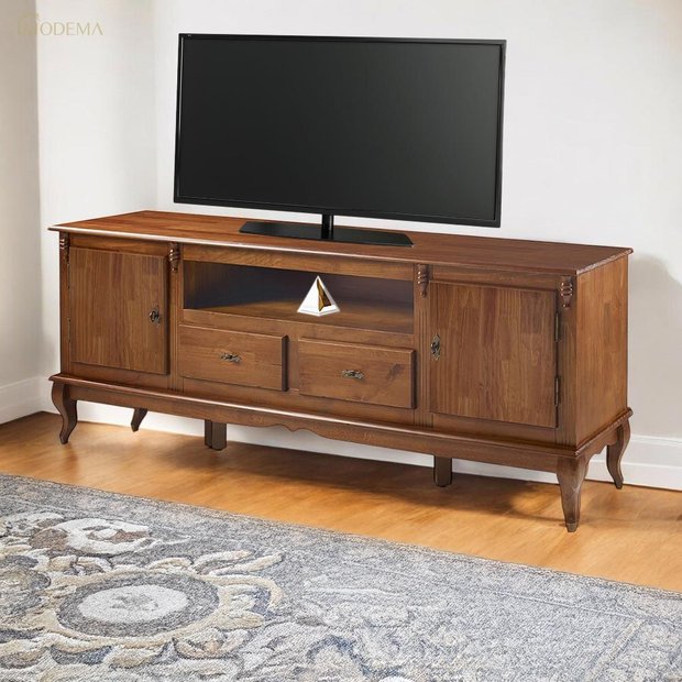 Combine funcionalidade e sofisticação para sua sala de estar com o Rack para Sala com Pés Luiz XV 2 Gavetas 2 Portas de Madeira e Nicho 60503M Linz Móveis. Produzido com materiais de extrema qualidade, este rack de madeira apresenta uma estrutura em madeira maciça. Seu design clássico é realçado pelos Pés Luiz XV, adicionando um toque de charme e requinte ao ambiente. Com duas gavetas espaçosas, duas portas e um nicho central, este rack retrô oferece amplo espaço de armazenamento para organizar seus eletrônicos, livros e objetos de decoração favoritos.