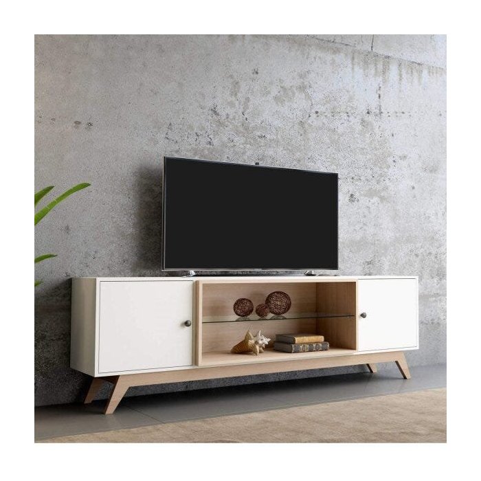 Rack para TV até 55 Polegadas 2 Portas 1 Prateleira de Vidro 180cm Retrô Dalla Costa Off White/Natural
