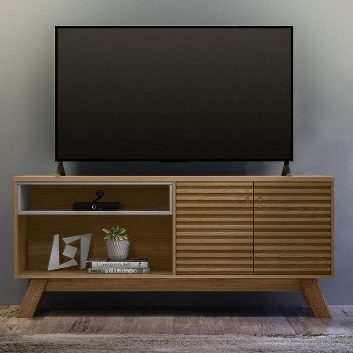Conta com um lindo design, pés em estilo retrô e porta de abrir com detalhe ripado, garantindo o espaço ideal para seus aparelhos e decorações!