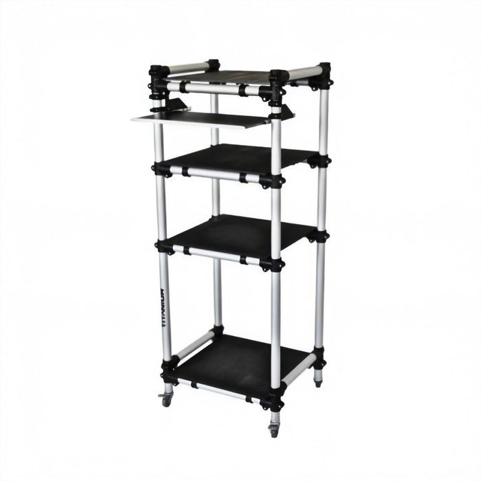 É um rack fabricado em alumínio, o que o torna leve para transporte, totalmente desmontável e resistente para suportar aparelhos pesados.