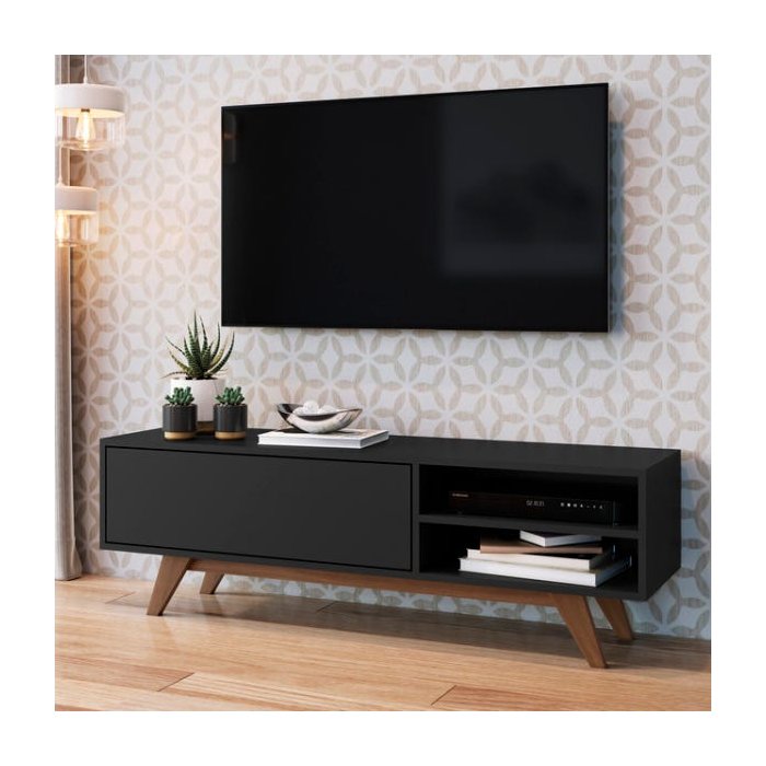 Rack Preto Baixo para Sala TV - com Porta e Pés de Madeira