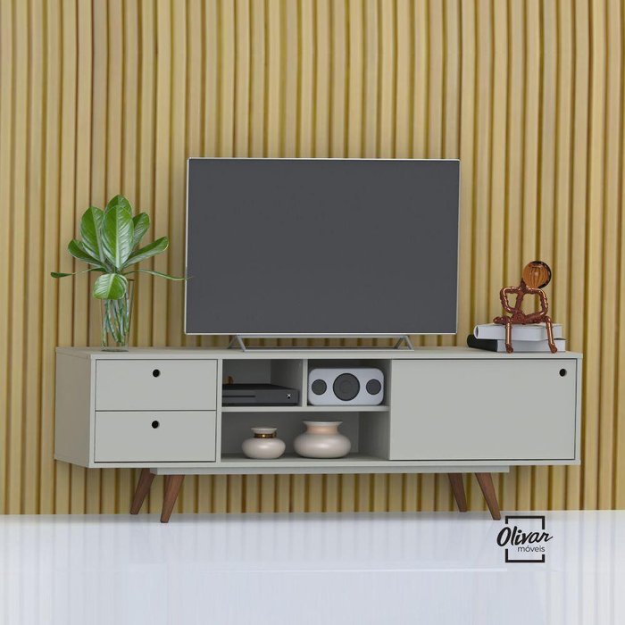 Rack Retrô 85 TV até 60 polegadas Sala De Tv Olivar Móveis Rack Retrô 85, possui porta deslizante em MDF, prateleira interna e compartimentos abertos para acomodação de diversos objetos. Possui pés palito em madeira envernizados trazendo o design retrô. Os produtos da Olivar Móveis não servem apenas para preencher os espaços da sua casa, mas sim para transformar em um lugar aconchegante, atraente e com um design moderno, sem abrir mão da qualidade.Tipo: RackModelo: Retrô 85Cor: Off WhiteDimensões (AxLxP): 54,7cm x 162cm x 38,5cmPeso do Produto Montado: 37,8kgCARACTERÍSTICASEstrutura: MDP/MDF de 15 e 25mmAcabamento Pintura UVEscala de brilho AcetinadoPeso máximo suportado: 30KgGarantia: 3 mesesPés Palitos de madeiraRodízios: não possuiQuantidade de gavetas: 2Corrediça metálicaQuantidade de portas: 1Tipo de portas: DeslizantePassa fio: SimQuantidade de prateleiras: 4Espaço para TV (LxP): 162cm x 38,5Para TV de até 60 PolegadasProduto necessita montagem? SimRecomendações de manutenção: Limpeza com pano umedecido. Não aplicar lustra móveis.Volume: 1ATENÇÃOIMAGENS MERAMENTE ILUSTRATIVAS, PODENDO HAVER ALGUMA VARIAÇÃO DE COR DEPENDENDO DE CADA TELA OU MONITOR.Rack Retrô 85 Tv atà 48 Polegadas Sala de Tv Olivar Móveis
