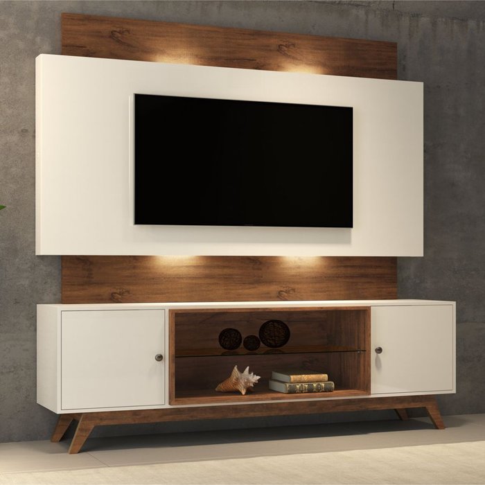 Com 1,80m de largura, 1,94m de altura total e profundidade de 35cm, esse conjunto é indicado para TVs de até 58" pois possui um painel de TV com 1,80x0,90m. Além disso, o painel possui afastamento para para que os fios passem por trás e não fiquem escondidos, sem atrapalhar o visual.