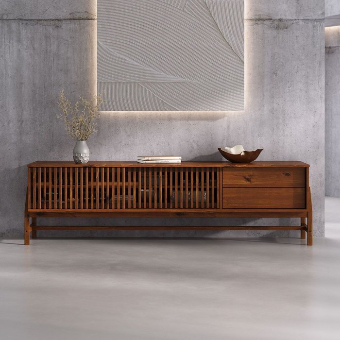 O Rack Adamo combina o melhor do design contemporâneo com a autenticidade da madeira natural. Feito inteiramente em madeira maciça, ele revela veios e nuances únicas que tornam cada peça exclusiva — um verdadeiro destaque na decoração da sala.