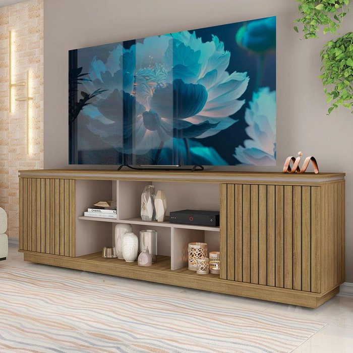 Rack Sala 75 Polegadas 2 Portas Ripadas 180cm Marrom Perfect Simetria Caemmum Lamina Mel Cacao Perfect