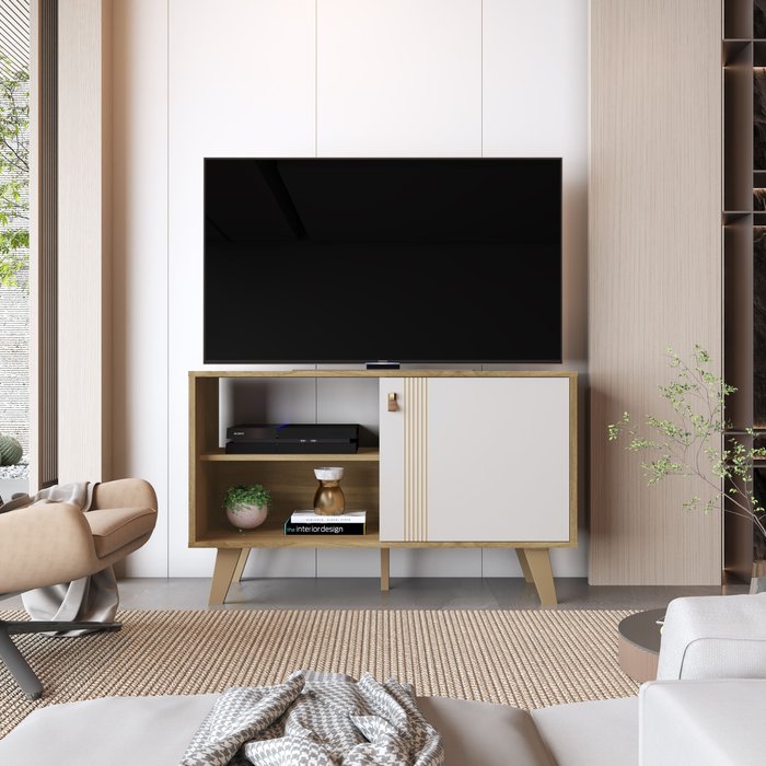 Rack Sevilha 90cm para Tv com 1 Porta Nicho e Pés de Polipropileno - Offwhite/nature Offwhite/nature