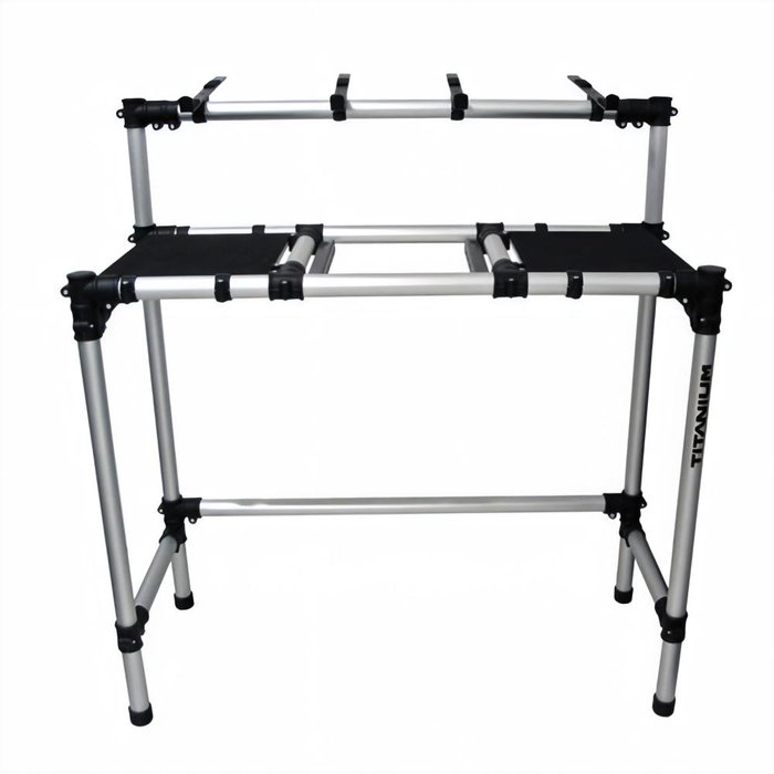 É um rack fabricado em alumínio, o que o torna leve para transporte, totalmente desmontável e resistente para suportar aparelhos pesados. Os Suportes são modulares podendo acomodar e adequar o seu equipamento da melhor forma e posição para sua performance de trabalho.