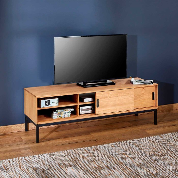 Apresentamos o elegante rack em madeira maciça Selma, perfeito para complementar qualquer ambiente com um toque de estilo industrial. Este rack possui três prateleiras espaçosas, oferecendo amplo espaço de armazenamento para exibir seus objetos de decoração favoritos, livros, dispositivos eletrônicos e muito mais. As duas portas de correr adicionam um charme adicional ao rack, permitindo que você exiba ou oculte facilmente os itens guardados. Feitas de madeira maciça, as portas deslizam suavemente, proporcionando facilidade de uso e um visual contemporâneo.