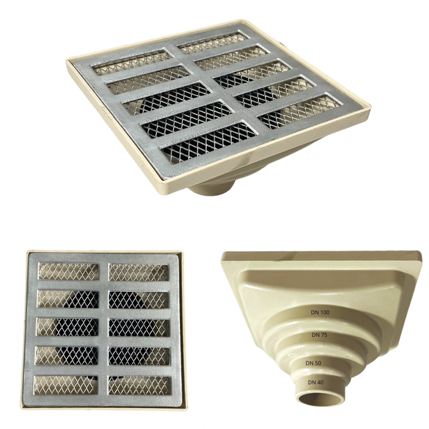Proporciona facilidade para os projetos de drenagem de águas pluviais, coletor com saída para baixo para tubos de 40mm, 50mm, 75mm e 100mm.