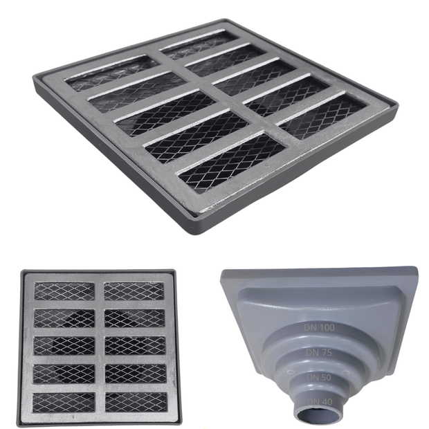 Ralo Pluvial Modelo 15x15 em Alumínio com Coletor de Plástico Saída Baixa Multiplas Saídas Adapt para tubo de 40mm, 50mm, 75mm e 100mm além de DUPLA proteção contra insetos