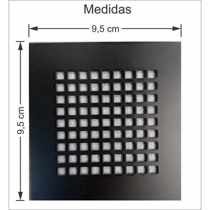 Grelha 9,5x9,5 cm base alumínio modelo square preto fosco 10x10 cm. Tampa confeccionada em inox 304 com espessura de 2 mm, base em alumínio, matéria prima que garante alta resistência a corrosão, facilidade de limpeza e assepsia, alto padrão estético associado a excelente custo/benefício.