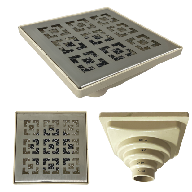 Ralo Inox 304 Modelo 15x15 Dubai com Tela e Coletor Bege Saída Adapt de 40mm até 100mm Bege