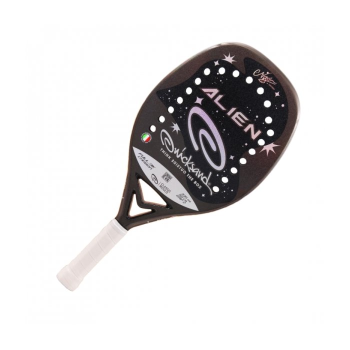 A raquete QUICKSAND ALIEN 2024 usa as tecnologias SLIM MOULD com espessura de 22mm, MULTI-HOLE com furos espalhados ao redor do centro da raquete e na posição frontal acompanhando a circunferência da cabeça da raquete. Composta por 100% CARBON 3K e BLACK EVA EXTRA SOFT de alta densidade, mais macio, onde a batida da bola na raquete é sentida intensamente, sem deixar de lado o controle e o conforto. Ideal para jogadores de nível intermediário e avançado em Beach Tennis, que buscam um equipamento que gere mais potência em seus golpes. A raquete possui um jateamento rugoso especial que promove uma melhor performance de alguns golpes como smash e saque.