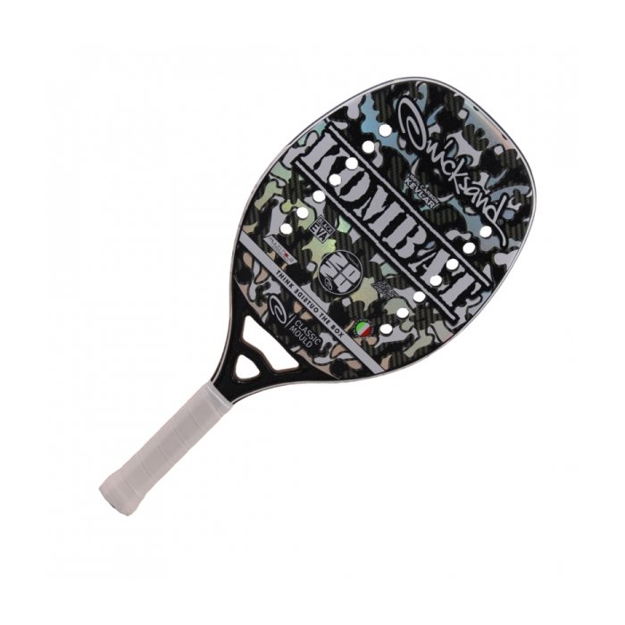 A raquete QUICKSAND KOMBAT 2024 usa as tecnologias SLIM MOULD com espessura de 21mm, MULTI-HOLE com furos espalhados ao redor do centro da raquete. Composta por CARBON 3K, KEVLAR e com WHITE EVA EXTRA SOFT de alta densidade, mais macio, onde a batida da bola na raquete é sentida intensamente, sem deixar de lado o controle e o conforto. Ideal para jogadores de nível intermediário e avançado em Beach Tennis, que buscam um equipamento que gere mais potência em seus golpes. A raquete possui um jateamento rugoso especial que promove uma melhor performance de alguns golpes como smash e saque.