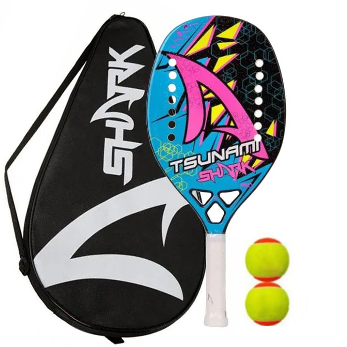 A Raquete de Beach Tennis Shark Tsunami 2022, foi desenvolvida em Fibra de Vidro, preenchida com EVA Soft deixando-a confortável, potente e precisa. Indicada para jogadores de nível avançado, possui uma pintura com tratamento em microgrânulos que ajudam a gerar efeitos.