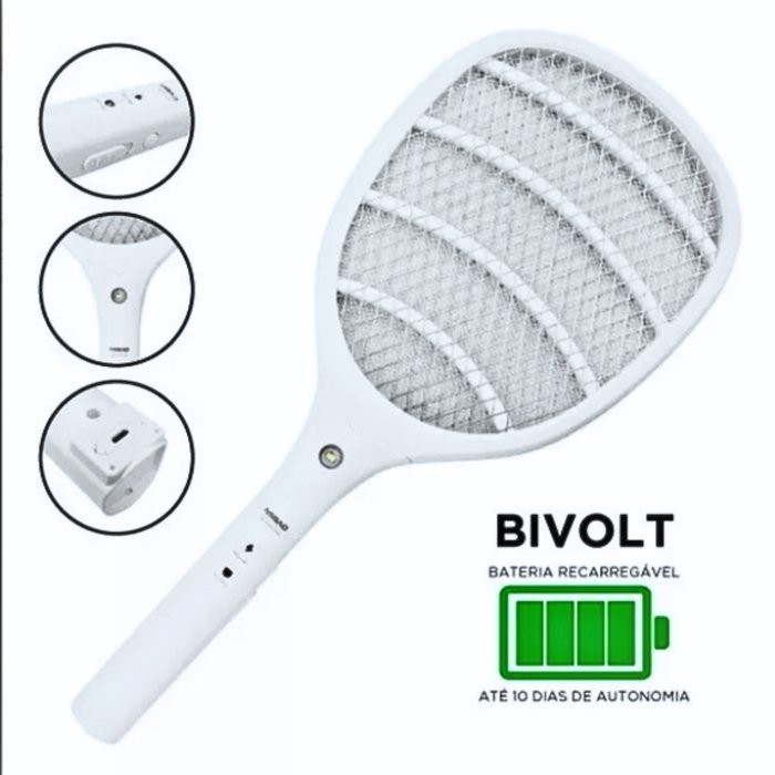 Raquete Mata Insetos Recarregavel C/ Luz de Led - Nsbao Branca