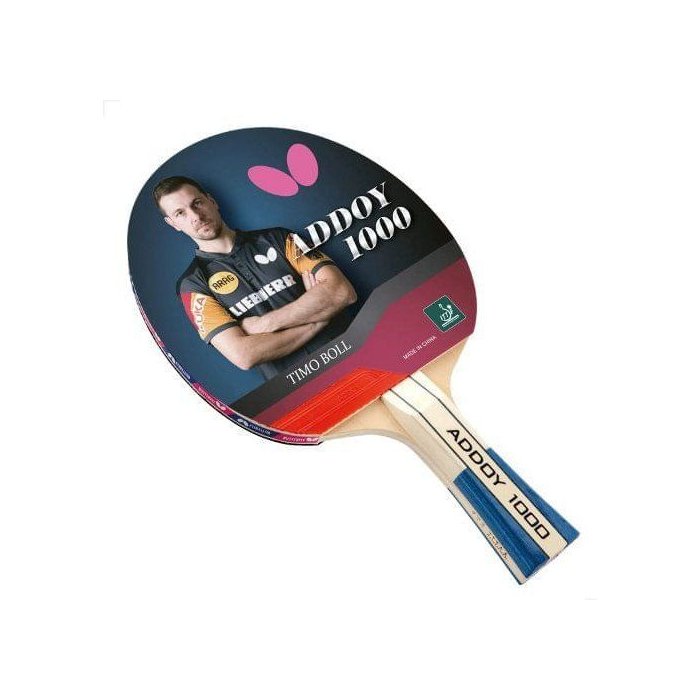 Com o shape regular, a Raquete Butterfly Addoy 1000 é formada por cinco lâminas de madeira coladas e sobrepostas, cobertas com borracha lisa nos dois lados. A série Addoy Butterfly foi projetado desde o início para o jogador recreativo. A borracha Addoy produz mais efeito e velocidade é perfeito para aqueles que estão começando a aprender o básico, com densidade macia dando ótima sensação no toque da bolinha. O cabo é padrão côncavo FL com detalhes em EVA para amortecer possíveis vibrações no cabo.