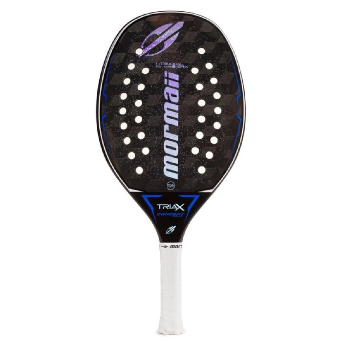 A raquete Triax Concept para beach tennis Mormaii tem frame de carbono e face de carbono 24k triaxial. O carbono 24k triaxial é a última geração dos carbonos. É o único tecido em 3 eixos ao invés de 2. Isso o torna mais elástico e macio, melhorando a potência e aumentando o conforto. Neste modelo não há furo no coração, por isso o comprimento da fibra é maior, trazendo uma experiência mais completa de potência, controle e conforto.