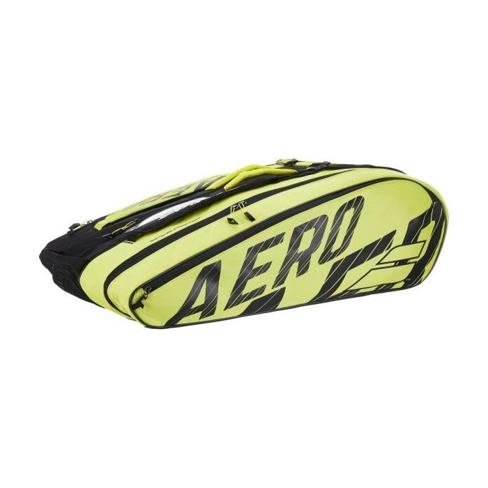 - Detalhamento: Capacidade para até 12 raquetes sem capa. 06 compartimentos com fechamento em zíper: sendo dois compartimentos térmicos, compartimento que possue pequenas bolsos internos e bolsa para guardar roupas ou outros objetos, bolso lateral com uma casca dura para proteger acessórios frágeis, e outro compartimento ventilado para tênis ou itens sujos e/ou úmidos, uma alça de mão para dar mais possibilidades de transporte e com isso mais conforto, alça de ombro ajustável e acolchoada. Escrita Babolat em uma das laterais e na outra lateral escrito Aero;