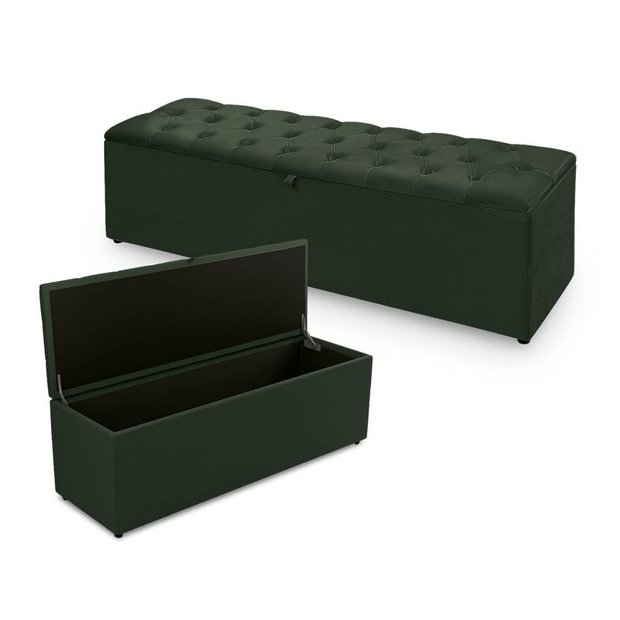 Possui grampos de aço galvanizado e é composto por espuma de alta resiliência. O mecanismo articulado é de aço para abertura e fechamento do baú. Produzido em Madeira de Lei reflorestada (eucalipto) com tratamentos anti-pragas. Seu tecido é tipo linho na cor Verde, com visual rústico e elegante. PROFUNDIDADE: 0,42m I ALTURA TOTAL: 0,42m I pés (sapatas): 0,02m I LARGURA (comprimento): 0,80m I PESO: 24kg.