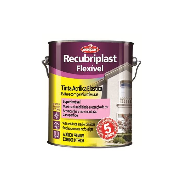 Descrição:Tinta acrílica para proteger e decorar fachadas, muros, empenas e paredes em geral. Aplicando nas condições recomendadas, evita e corrige microfissuras até 0,03 mm. Após o período de cura, forma uma película com aspecto emborrachado, de ótimo nivelamento sem emendas, impermeável e flexível. Possuí dupla ação contra mofo e algas e é capaz de acompanhar a dilatação e retração das paredes causadas pela mudança de temperatura.