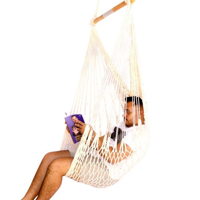 Rede Cadeira Trançada Bege Conheça nosso modelo deRede Suspensa ou Rede Cadeira Trançada. Esse modelo de rede cadeira é feita emcordão 100% algodão, altamente reforçado.Seu trançado parece uma rede tarrafa, não contém nós, dando mais conforto ao usuário. A Rede Cadeira trançada pode ser instalada em qualquer ambiente quer seja interno ou externo. Para ambientes externos, por ser um produto de algodão, recomendamos que a rede seja guardada em dias chuvosos e que evite sol. Dimensões: 1,00 m x , 1,00 m