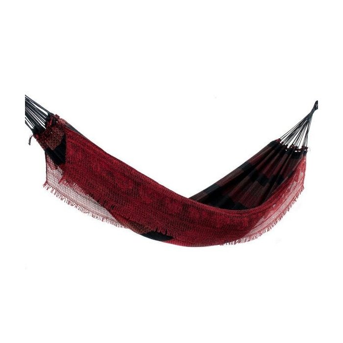 Seu babado lateral (varandas) é um macramê industrial em duas cores, em formato de coração nas cores vermelho e preto. Nossas redes de dormir valorizam e apoiam o trabalho manual e seu artesanato, criando produtos com qualidade, durabilidade, beleza e que proporciona conforto e bem estar.