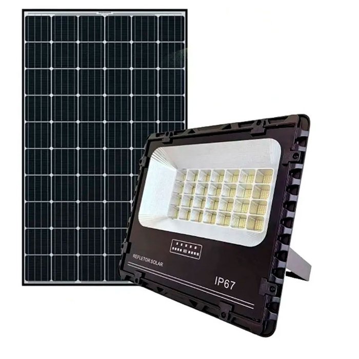 O Refletor Solar de 1000W é uma solução de iluminação inovadora e altamente resistente, projetada para funcionar 100% com energia solar. Com um design moderno e prático, ele é perfeito para locais sem infraestrutura elétrica, eliminando a necessidade de cabeamento e o uso da rede elétrica tradicional.