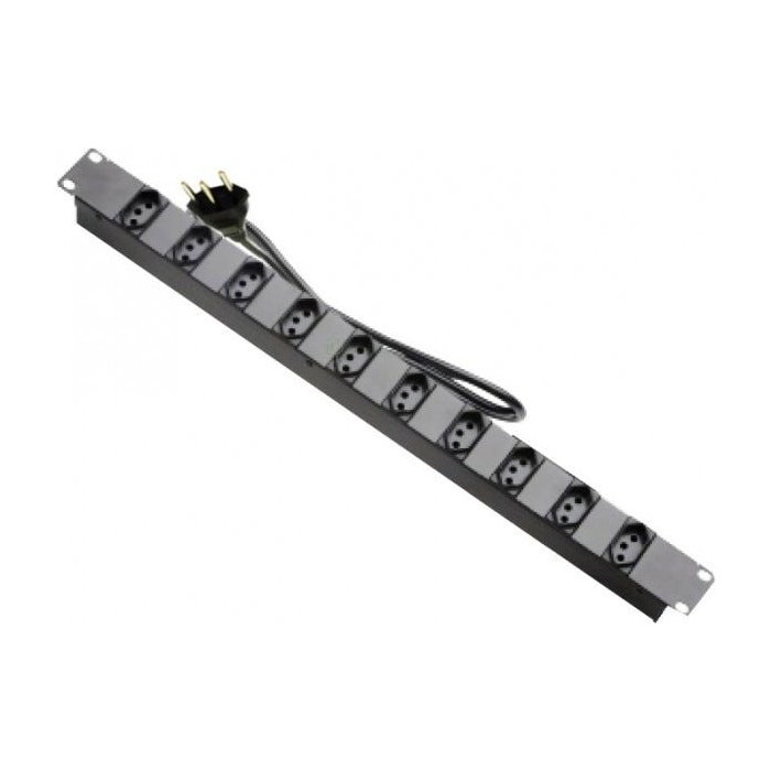 Régua para fixação em racks e gabinetes em data center e Telecom, utilizada para conexão elétrica aterrada de equipamentos que possuam plug para alimentação com o Novo Padrão Brasileiro (NBR 14136) de Tomadas.