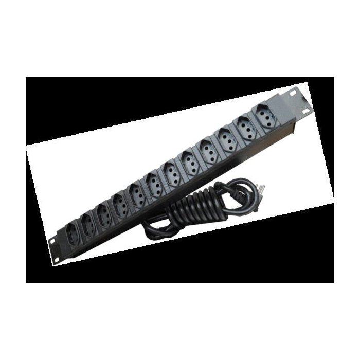 Régua para fixação em racks e gabinetes em data center e Telecom, utilizada para conexão elétrica aterrada de equipamentos que possuam plug para alimentação com o Novo Padrão Brasileiro (NBR 14136) de Tomadas.