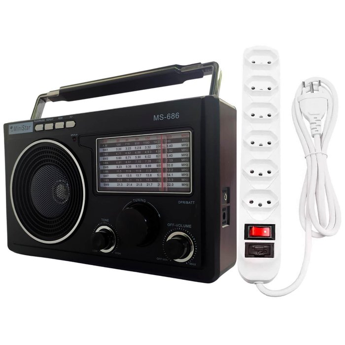 Kit com filtro de linha 6 tomadas e rádio retrô. conheça os produtos: