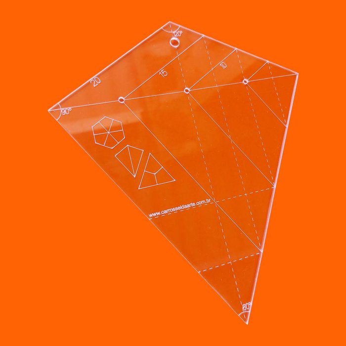 Régua para Patchwork Pipa Plus Régua com pétalas de 10, 15, e 20cm de altura, para blocas de até 40 cm. Com ângulos de 60, 90 e 120 graus. Trabalhos: colchas, centros de mesa, bolsas e jogos americanos e tudo mais que a sua imaginação permitir A régua facilitando seu trabalho na montagem do bloco. Esta Régua facilita o corte e marcação precisos das margens a serem costuradas e cortadas. Facilita o uso dos cortadores de 18, 28 E 45 mm para corte direto. Ideal para Patchwork, Scrapbook. Tamanho: 17,3 x 20 cm Marca: Carrossel da Arte Material: Acrílico Virgem Cor: Cristal transparente Espessura: 2 mm Régua gravada a laser, que nunca vão ser apagadas.