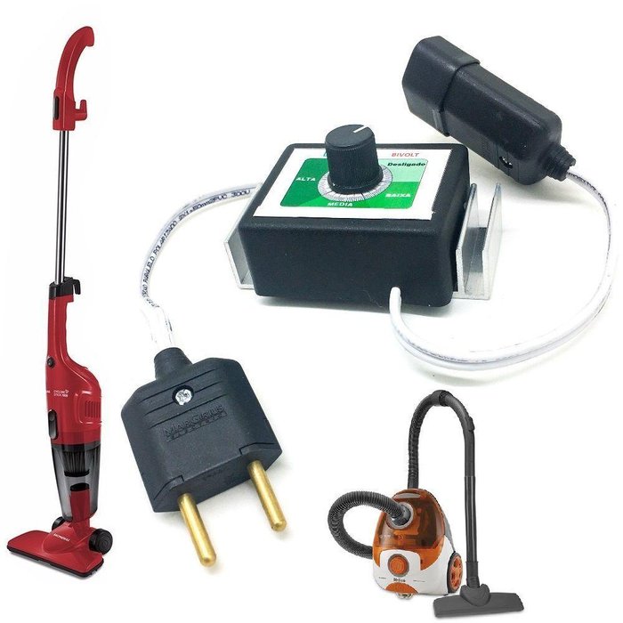 Atenção O Dimmer Não acompanha a vassoura eletrica e nem o aspirador de pó (Imagem ilustrativa) O Dimmer serve para reduzir a potência dos equipamentos através de um sistema eletrônico comandado por um potenciômetro giratório (botão). Com o girar do botão obtemos reduções da sucção do ar ( controle variavel do volume de ar) consequentemente iremos ter redução de ruidos gerados durante o uso. (Reduzindo a velocidade do motor do aspirador também se reduz o poder de sucção, então em locais mais sujos é necessário aumentar a potencia utilizando o dimmer)