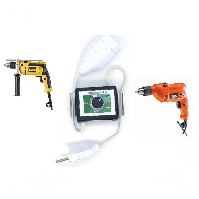 Atenção O anuncio Não acompanha furadeira ou parafusadeira O Dimmer serve para reduzir a potência dos equipamentos através de um sistema eletrônico comandado por um potenciômetro giratório (botão). Com o girar do botão obteremos reduções de velocidade ( Variador de velocidade de motores) ou dos equipamentos conectados na saída do Dimmer e consequentemente iremos ter economia de energia elétrica ou ruidos gerados durante o uso.